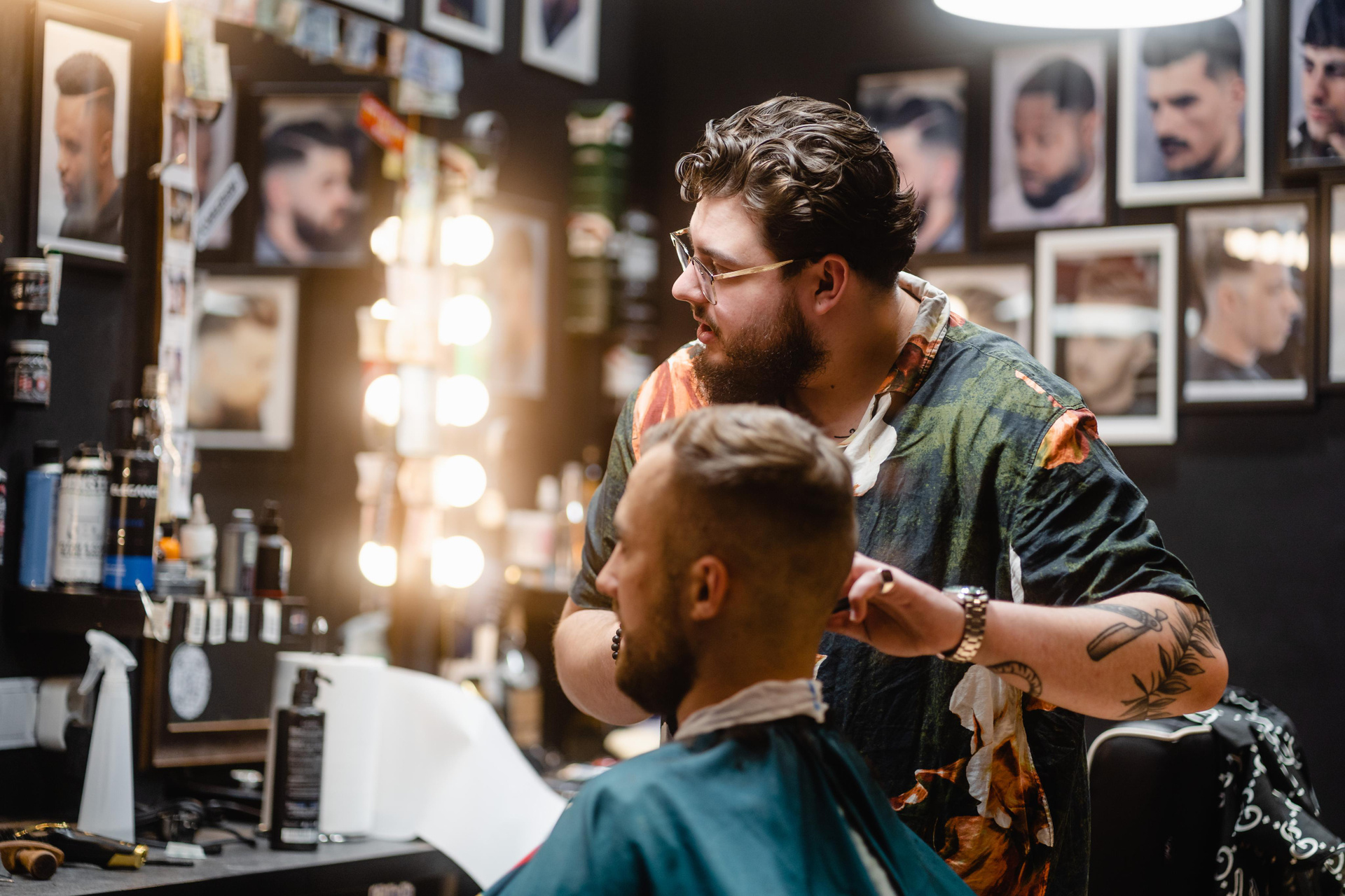 A barber styling a client’s hair in a lively barbershop filled with warm lights and vibrant decor