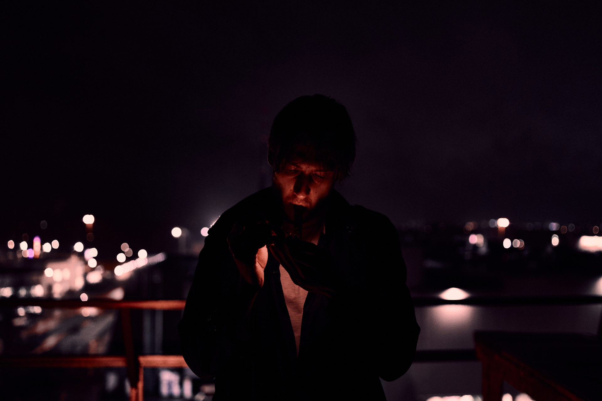 A man standing on a rooftop at night, illuminated by soft light, with a city skyline blurred in the background, exuding a moody and reflective atmosphere.