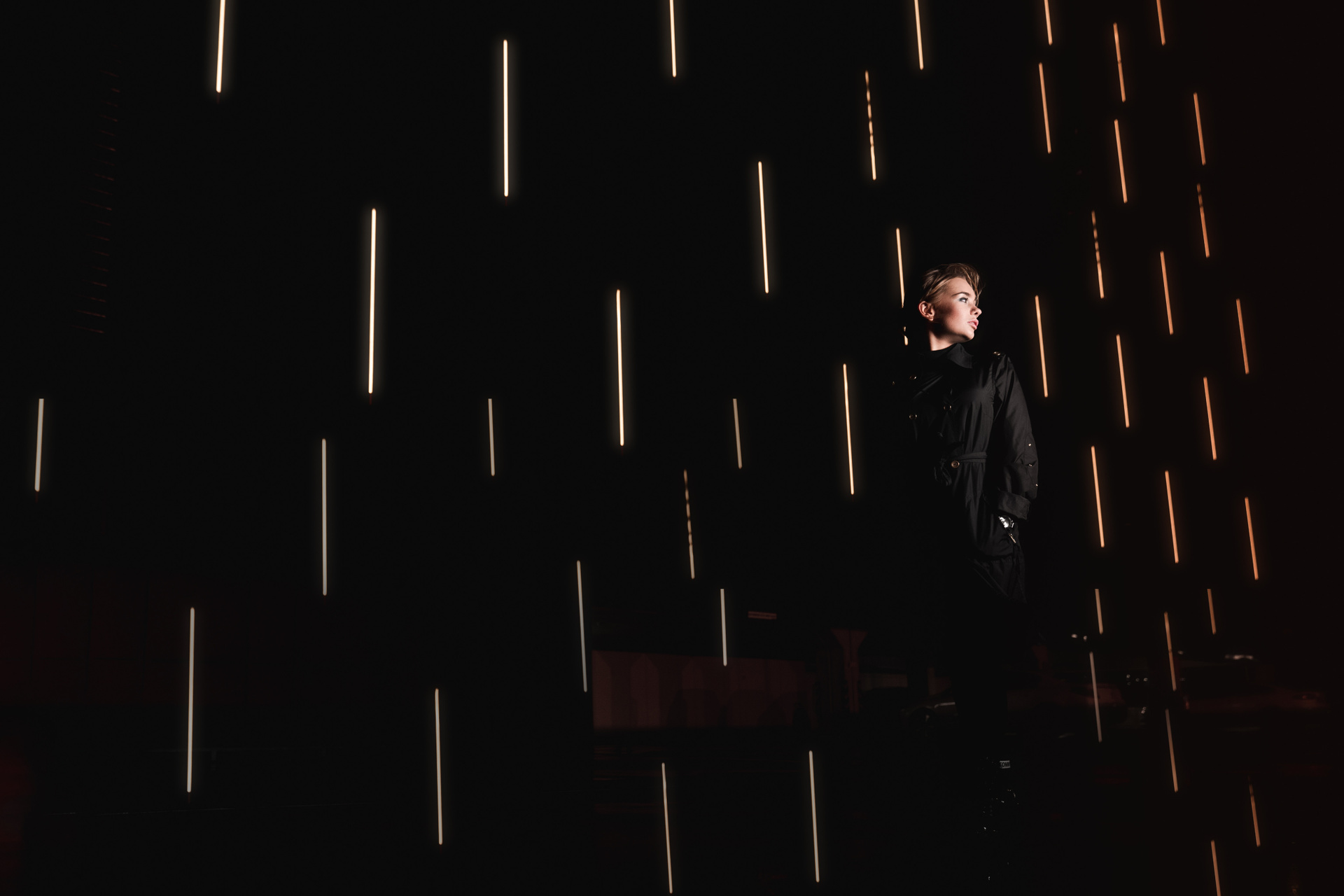 A minimalist photo of a dark space with streaks of light illuminating a single figure in a suit, evoking mystery and sophistication.